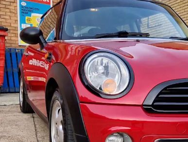 *in photo: Mini Cooper Full Red Wrap, Dechrome, Window tints, Sunstrip, Projector shadow lights